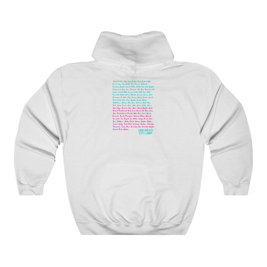 San Diego Neighborhoods Hoodie, SD Areas on back (Pink & Teal)