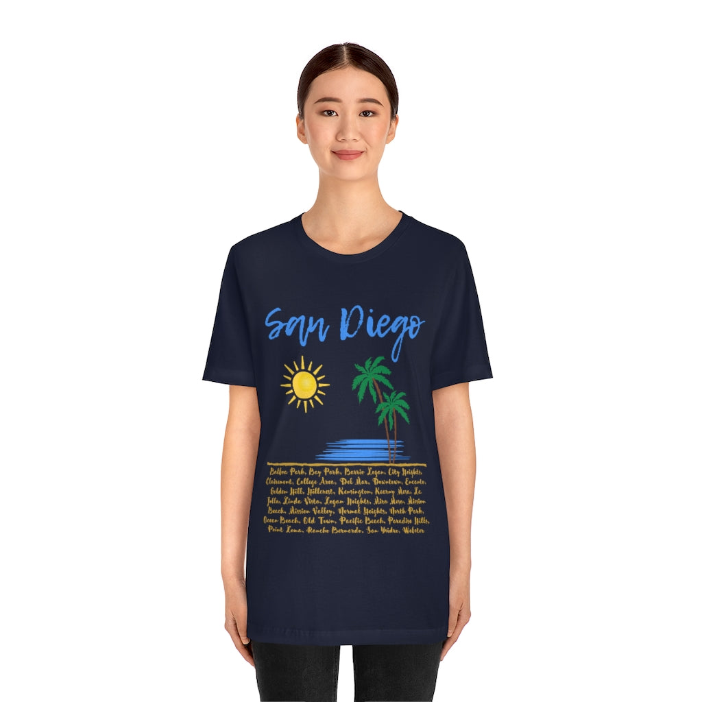 This "San Diego Beach" tee is perfect for San Diegans to rep America's Finest City. We're shouting out many of SD's neighborhoods on the front & the back of the tee. This one-of-a-kind t-shirt makes an excellent gift for San Diegans (near and far) or a great souvenir from your visit.