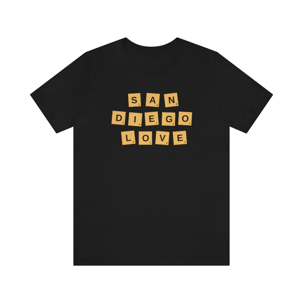 A fun t-shirt with San Diego Love spelled out with Scrabble blocks. A great gift idea for someone who loves to play Scrabble.
